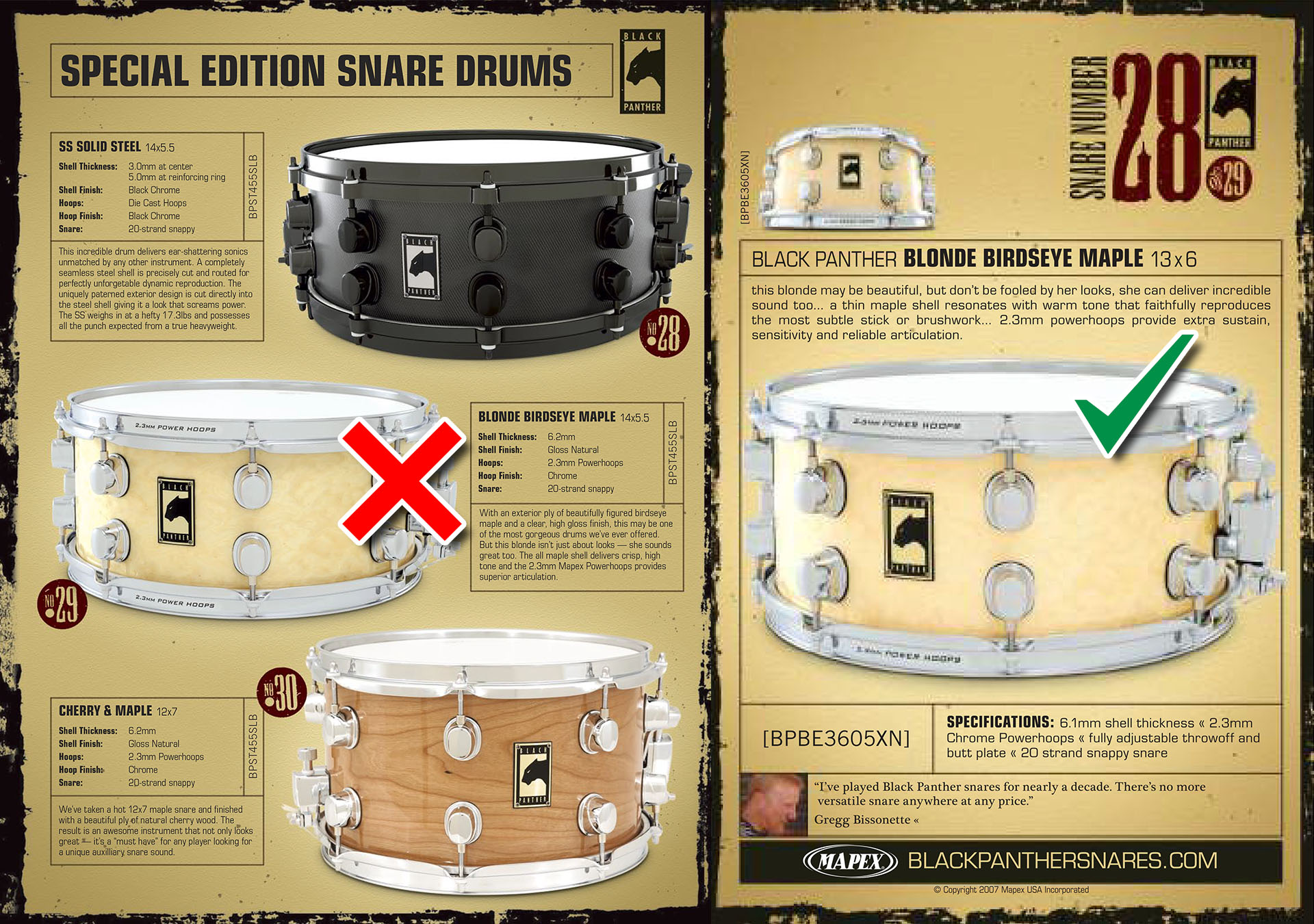 Since I started the archive, I’ve been trying to track down any photos of what is described in Mapex’s 2007 USA Catalogue (or at least, the only version I can find) as the 14”x5.5” Blonde Birdseye Maple. The search wasn’t helped by the wrong catalogue number being listed – BPST455SLB – which is the correct number for the Solid Steel.