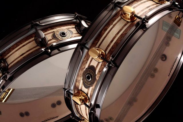 This one is a super-hard all-maple shell, with a dark stained oil and wax finished birds eye maple exterior ply, his signature natural racing stripes and gold lugs/strainer with black power hoops.