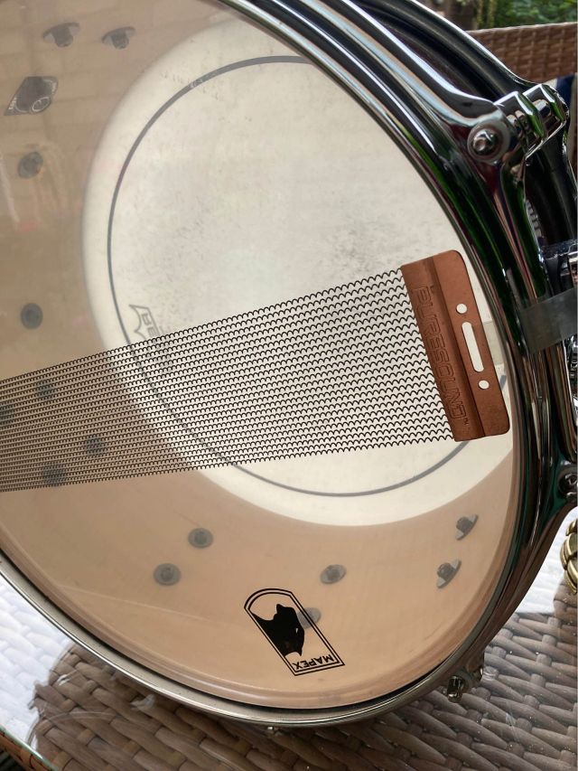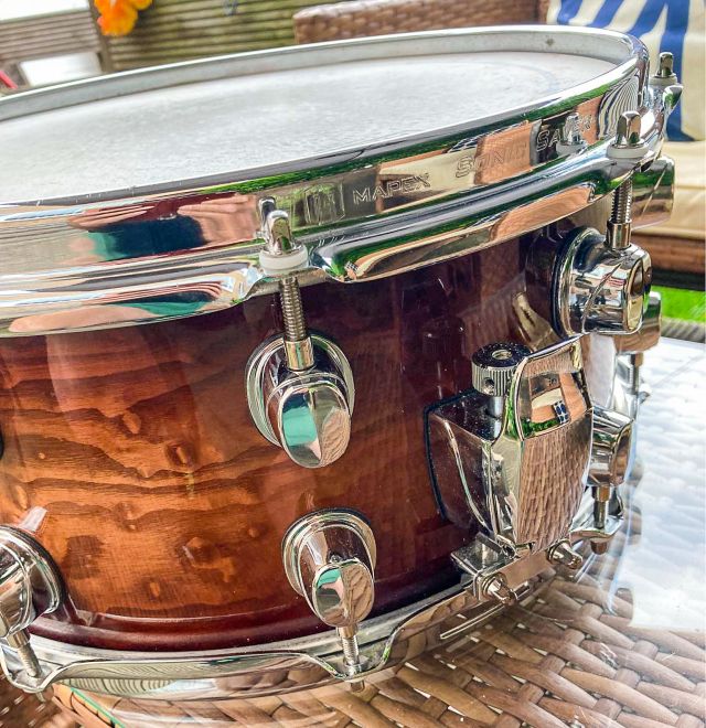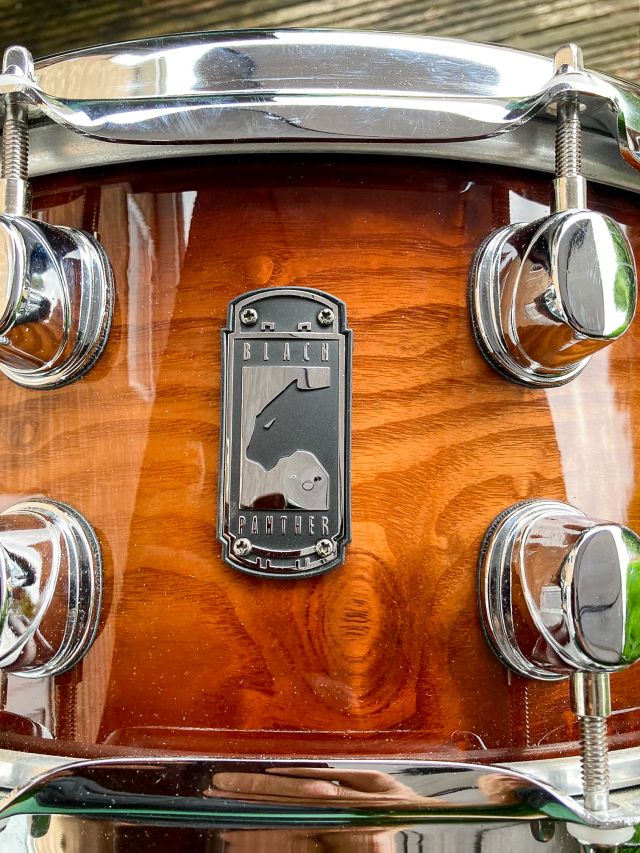 The shell itself is 14"x6.5" and it's finished in what's usually termed "Brown Sugar Burst" on other similar shells. It appears to be a 6ply shell which would normally put it in the 5.1mm (ish) range rather than the thicker 8.5mm shells of the mid-2000s Walnut shells. But honestly that's guesswork at the moment, as is the assumption that it's a late 2000s production, since it's got the later Black Panther badge, but still has the low-mass oval lugs of the pre-2010 snares.